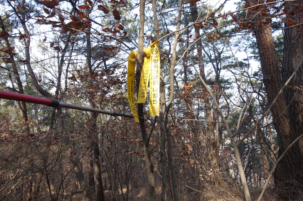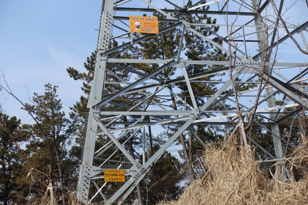 대니산에서 진등산으로 이어가는 능선을 만나며는 한전 관리 표시기들이 보이고