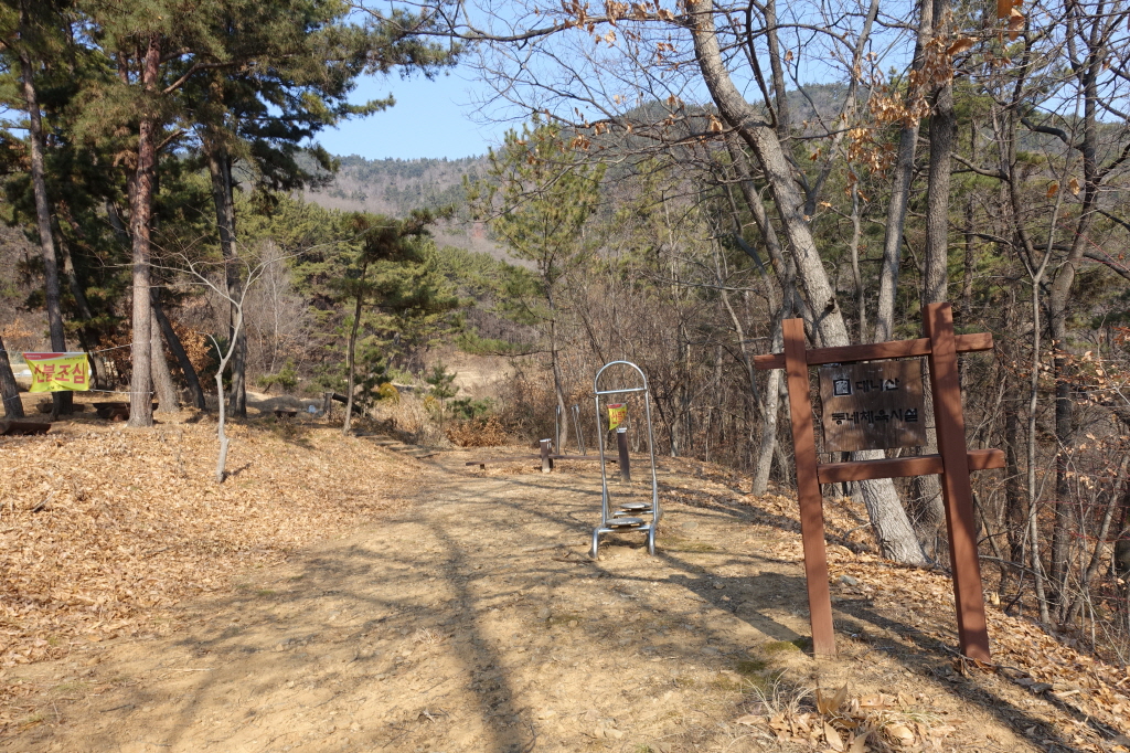 소나무가 빽빽한 산길따라 운동시설이있는 쉼터을 지나 내려가고
