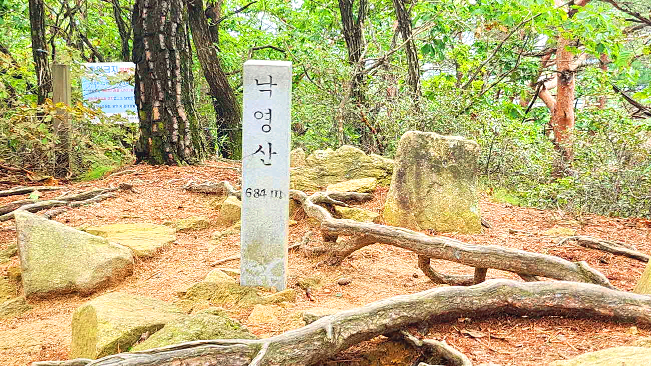 국립공원 이정표와 이곳 주민들은 684봉을 낙영산 정상으로 부르고