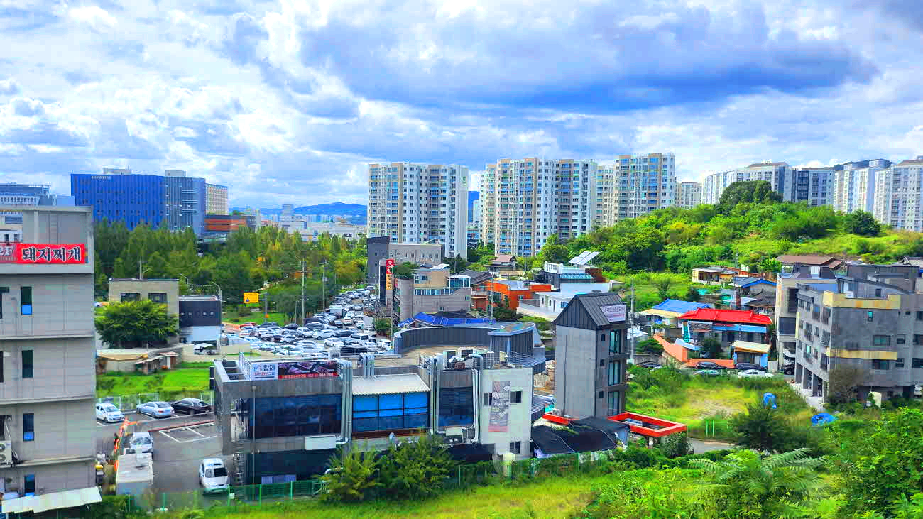 단산지 둑아래 주차장과 이시아 폴리스 아파트들