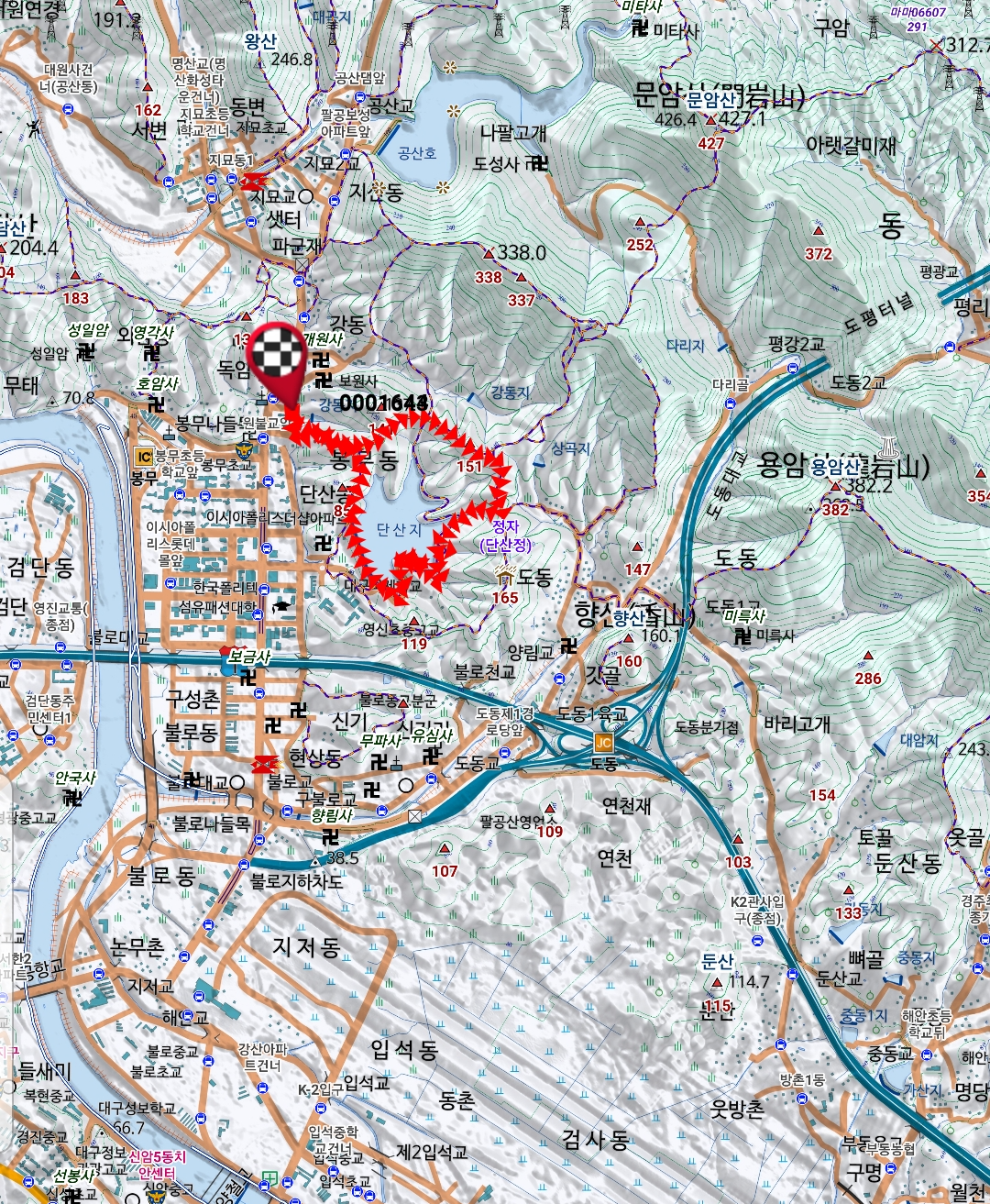 봉무공원 단산지 (丹山地)는 붉은 흙이 나왔다하여 단산(丹山)마을이라 하였으며,