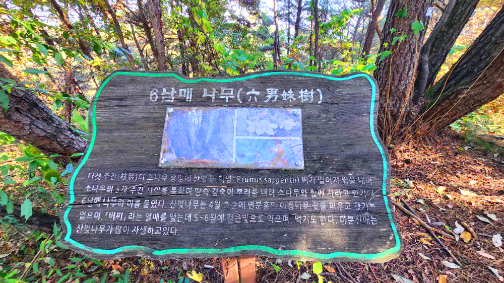 다섯 줄기의 소나무와 그 사이에 있는 산벚나무가 한뿌리에서 자란다.
