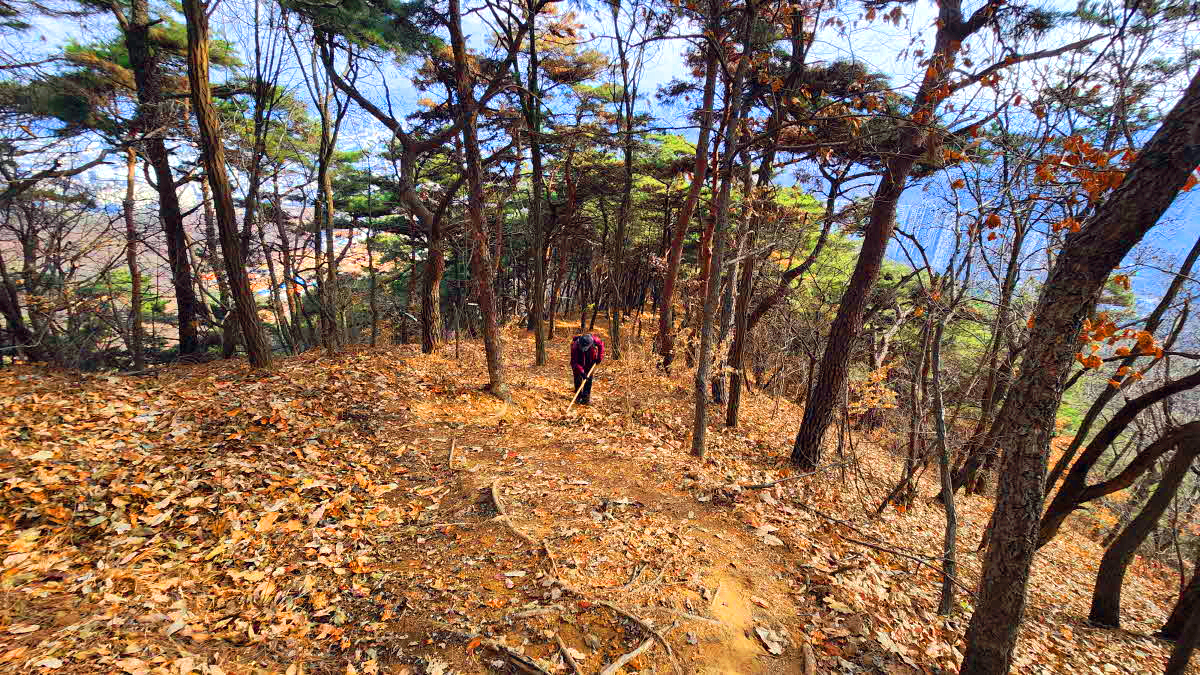 하산길 급경사 등산로에 후답자들이 미끄러지지않게 낙엽을 쓸면서