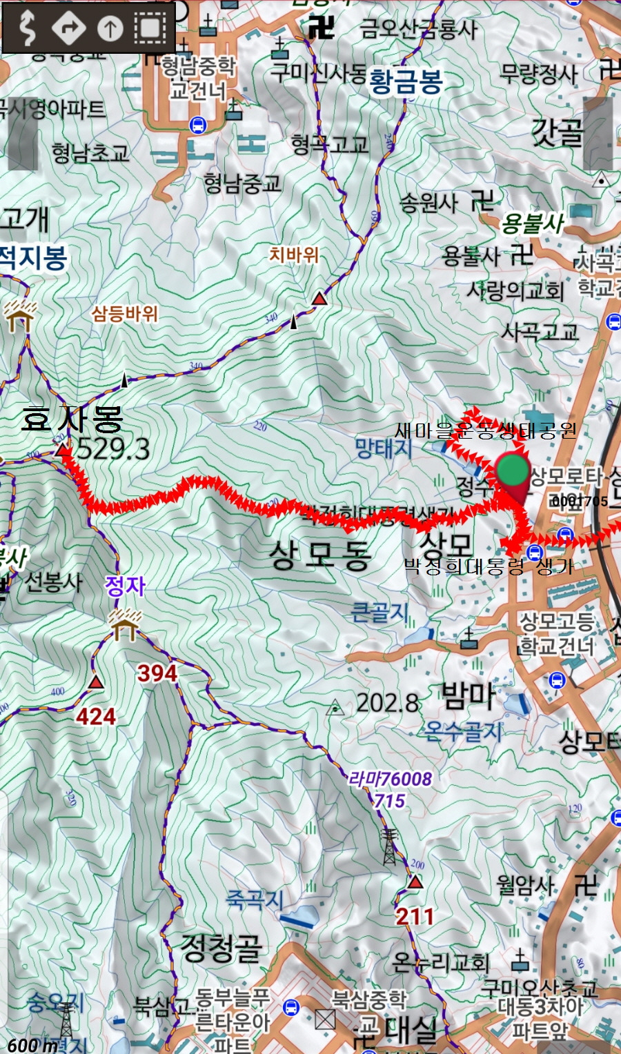 형곡방면 골짜기에 금오랜드도보인다.