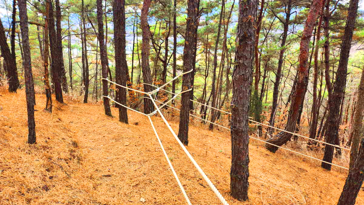 급경사에 지그재그로 밧줄이 길게 매여있다.