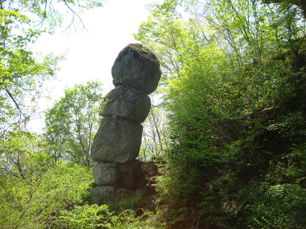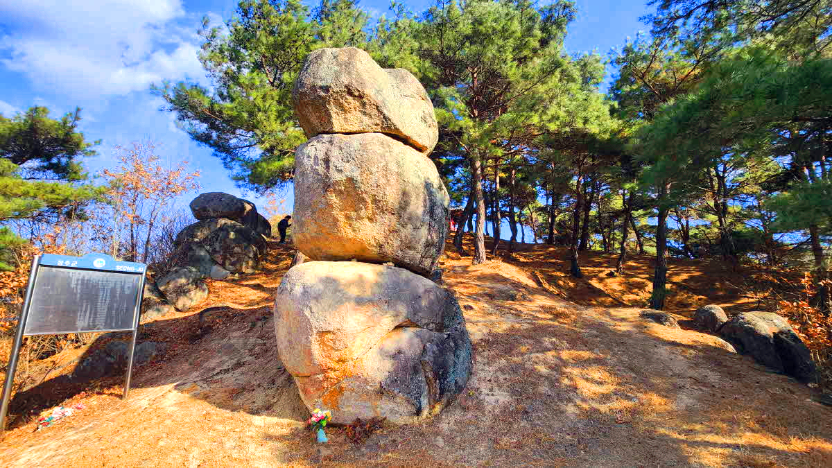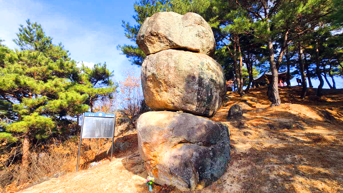 마치 공깃돌처럼 생긴 커다란 바위 세 개가 위아래로 나란히 포개어 있다. 이 바윗돌은