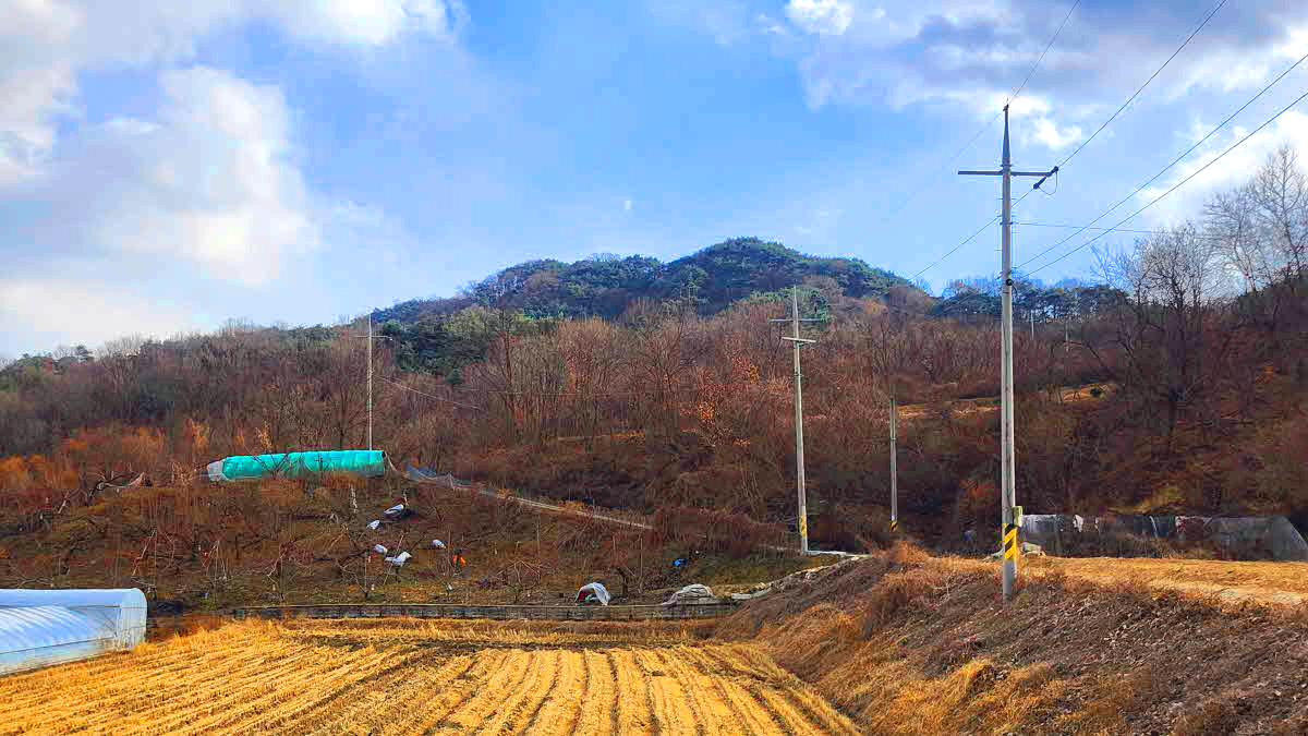 정면으로 민가와 농장이 보이는데 뒷산이 지도상 태자봉 최고봉인데