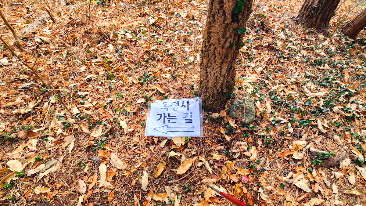 좌측으로 옥정사 방향표시가 땅에떨어져있어도 방향을 바로가르키고있다.
