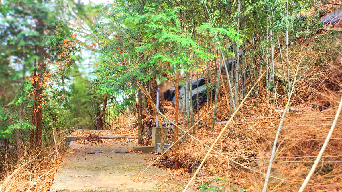 대나무사이로 이리저리 길을찾아내려가니 옥정사뒤로 내려서고 사찰 울타리로