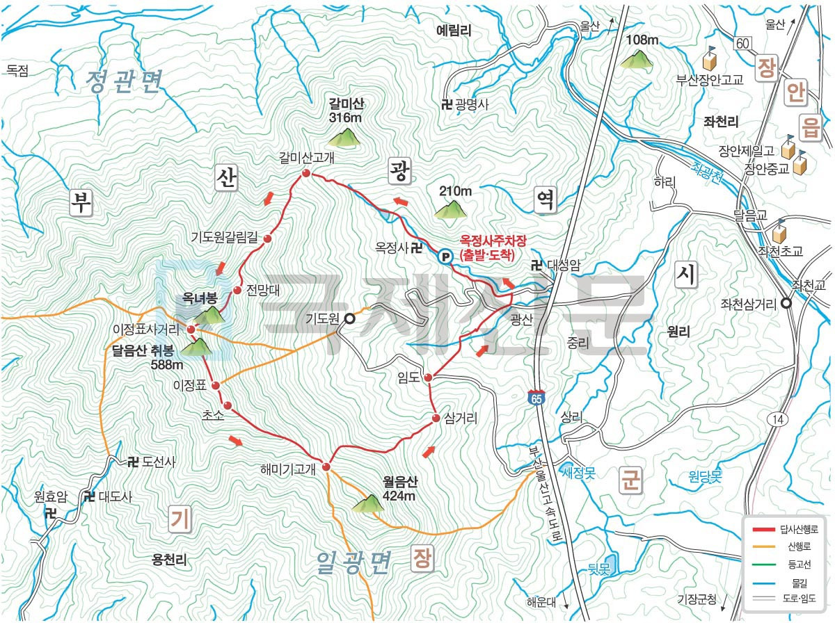 기장청소년수련원 - 등산로입구 정자 - 통신탑 - 옥정사 갈림길 - 달음산정산 -