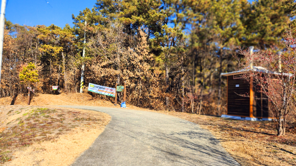 우측에 간이 화장실과 현수막 뒤로가 문산등산로입구이다.