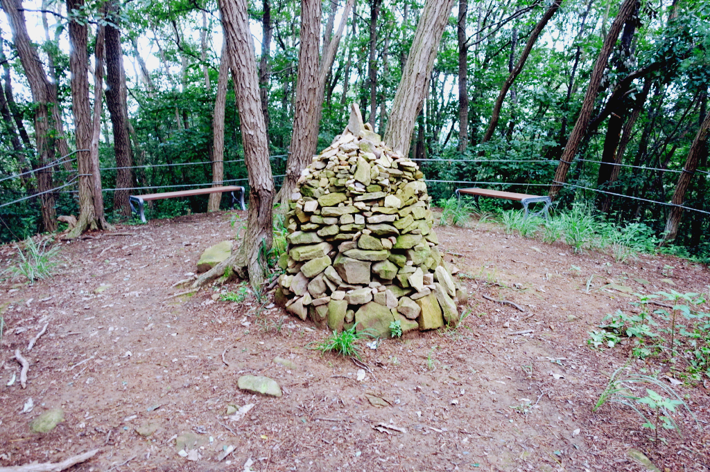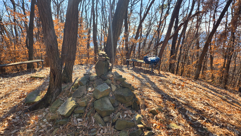 정상 쉼터에는 긴의자몆개가있고 간이 운동시설 허리돌리기와