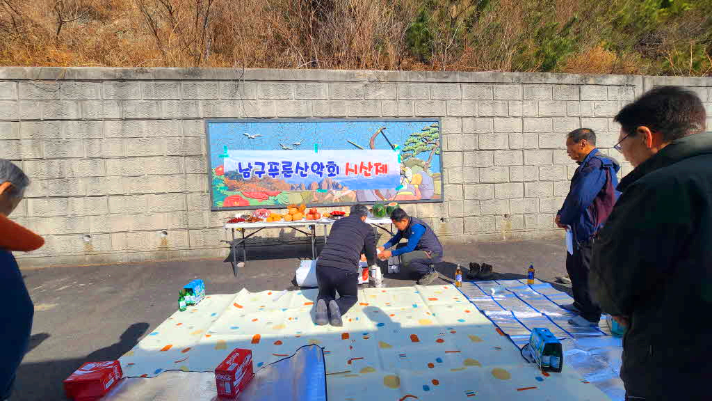 주차장 옹벽에 현수막을 붙이고 제물을 차려놓고