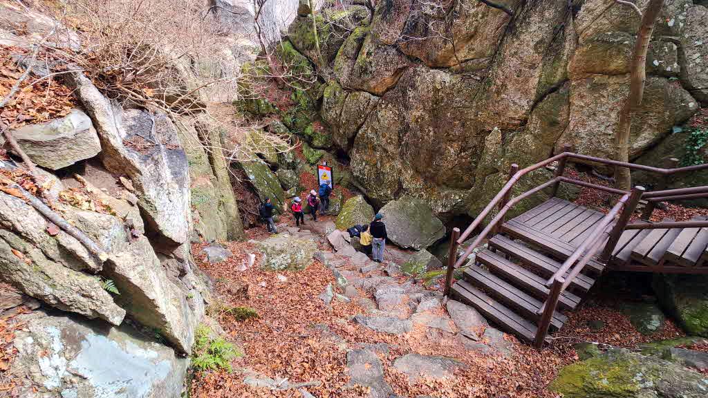 계속되는 급경사 돌계단하산으로 모두가 힘들어할적에