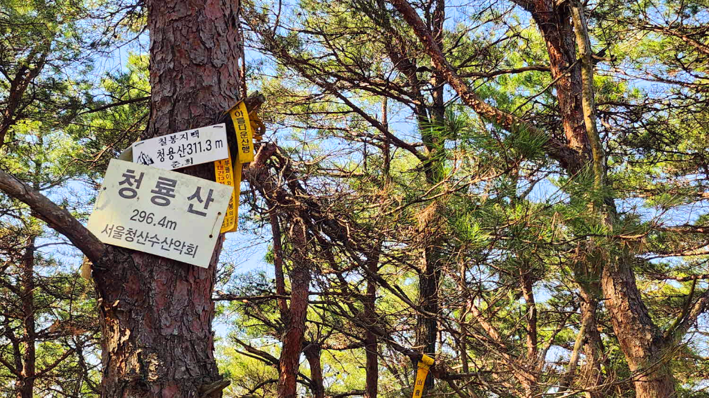 서울 청산수산악회 청룡산 높이 296.4m 표시판은 삼각점봉에있던것을