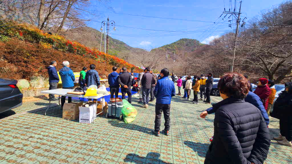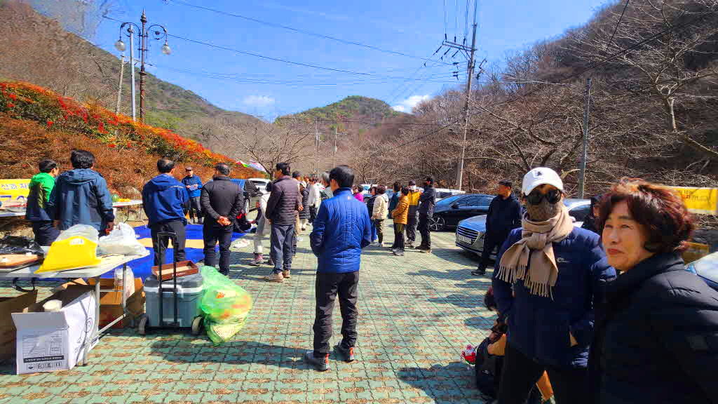 주차장 담벽에 현수막을 붙이고 시산제 준비을 하는데 장안사 주차장관리하는